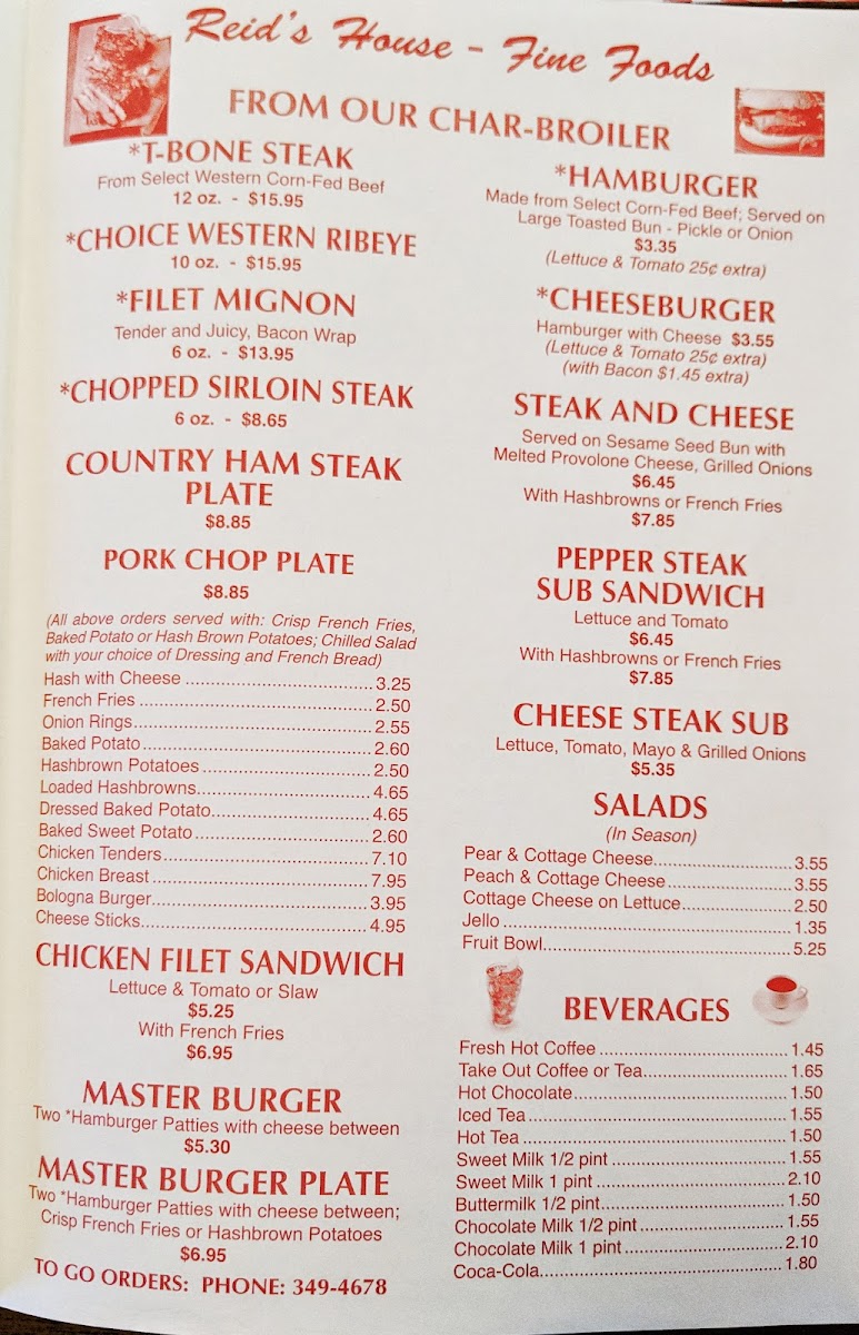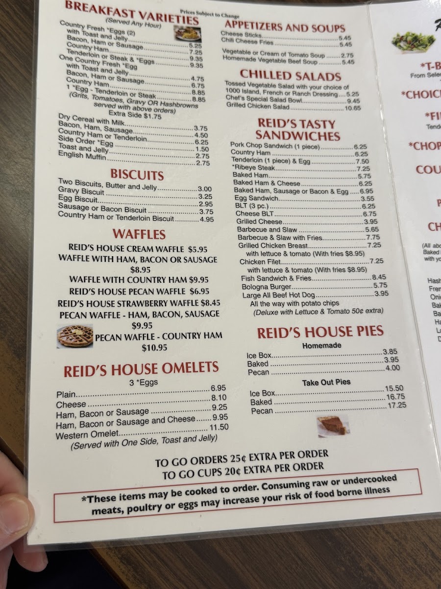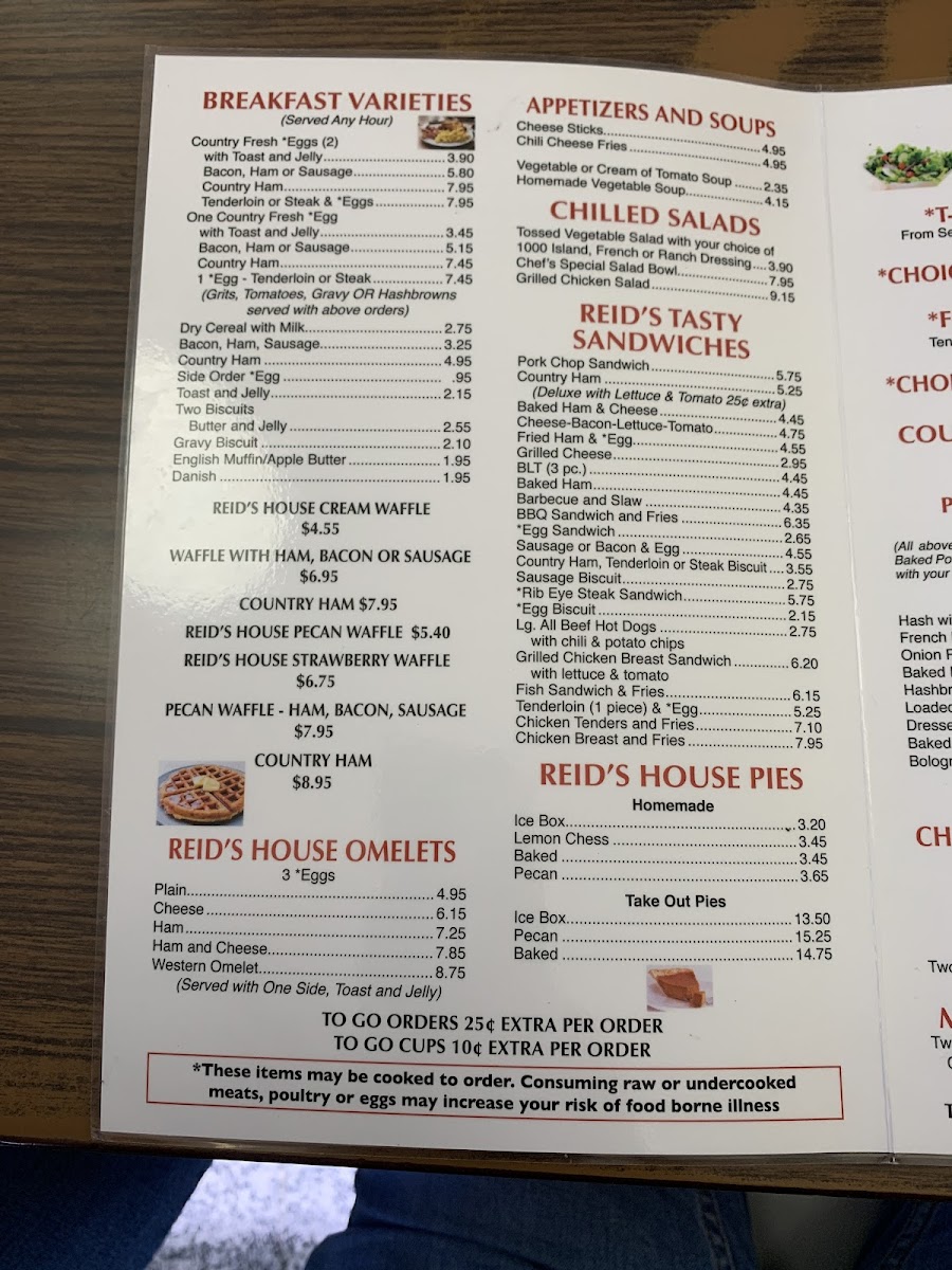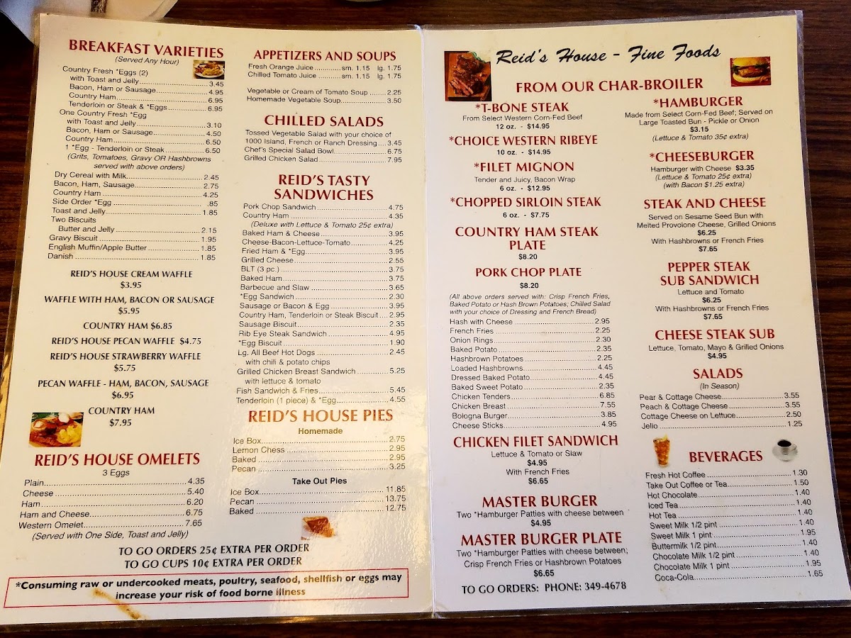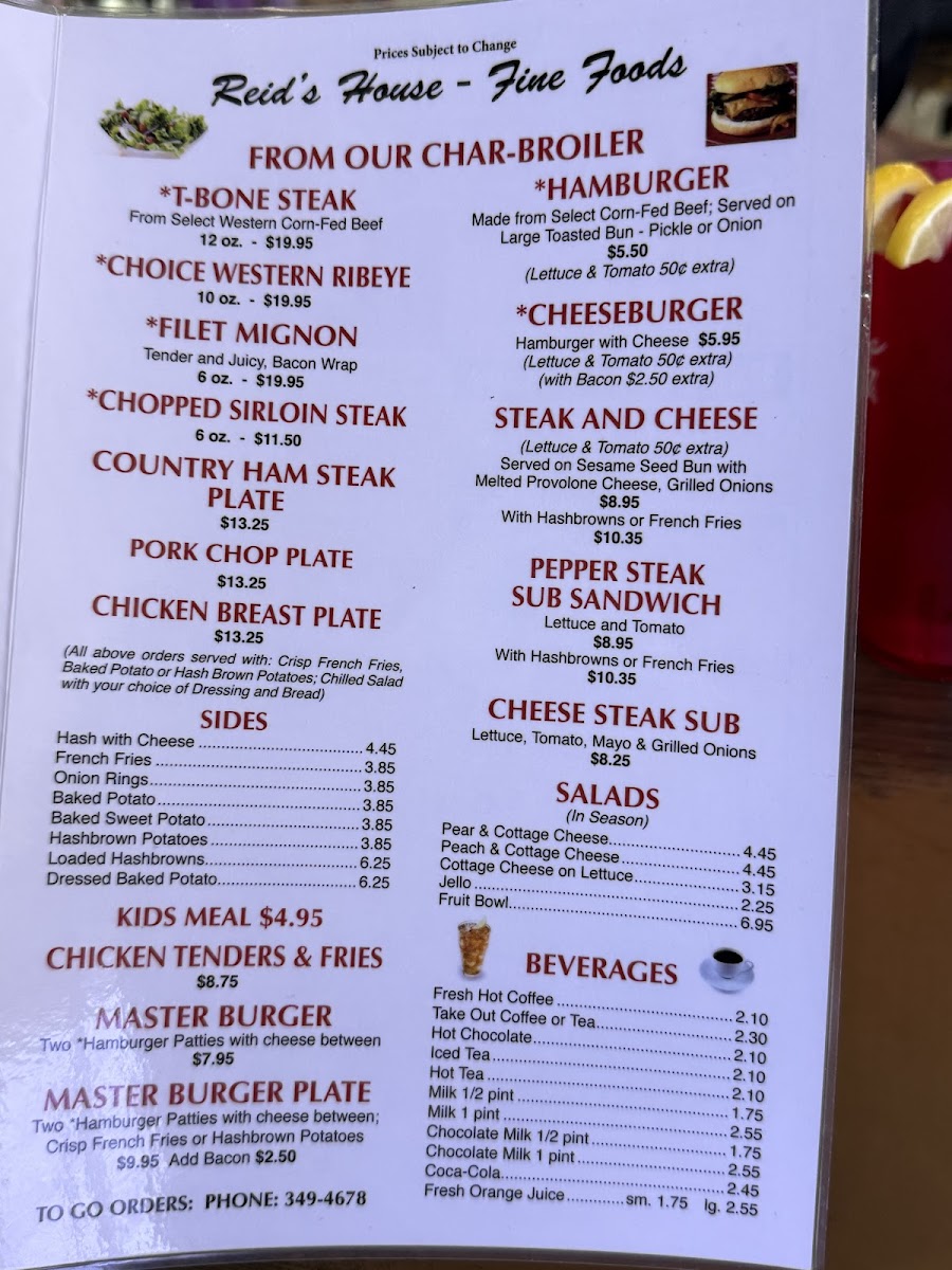 Welcome to Reid's House Restaurant, your go-to spot in Reidsville for a mouthwatering dining experience! Located at 1220 S Scales St, our menu is bursting with beloved classics and signature dishes that are sure to tantalize your taste buds. Start your day with our World Famous Waffle Awful or savor the hearty Country Ham Eggs N Cheese Hash Browns N Gravy for a breakfast that will keep you fueled. For lunch, don't miss the juicy Steak and Cheese Sandwich or our all-time favorite Cheeseburger. As you indulge in these flavors, make sure to save room for a slice of our homemade Coconut Cream Pie or the irresistible Strawberry Pieāboth are local legends! With comforting options like Spaghetti, Crispy Bacon, and Sweet Potatoes Pie, there's something for everyone at Reid's House. Join us for a meal that feels like home, and let our menu's specialties draw you in for an unforgettable experience!